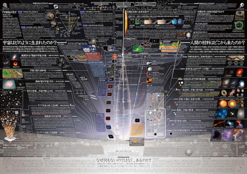 わたしたちが住む宇宙は、いったいどんな世界なのでしょうか?科学ポスター「一家に1枚宇宙図」を使って、現代の天文学が明らかにした、宇宙のはじまりから私たち人間が誕生するまでの長い長い物語を読み解いてみましょう。宇宙についての質問も大歓迎です。